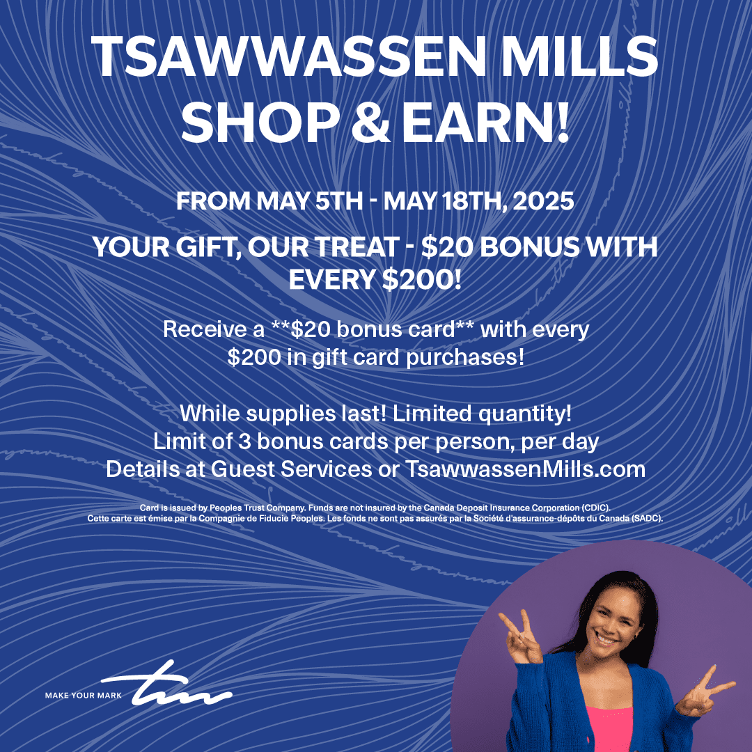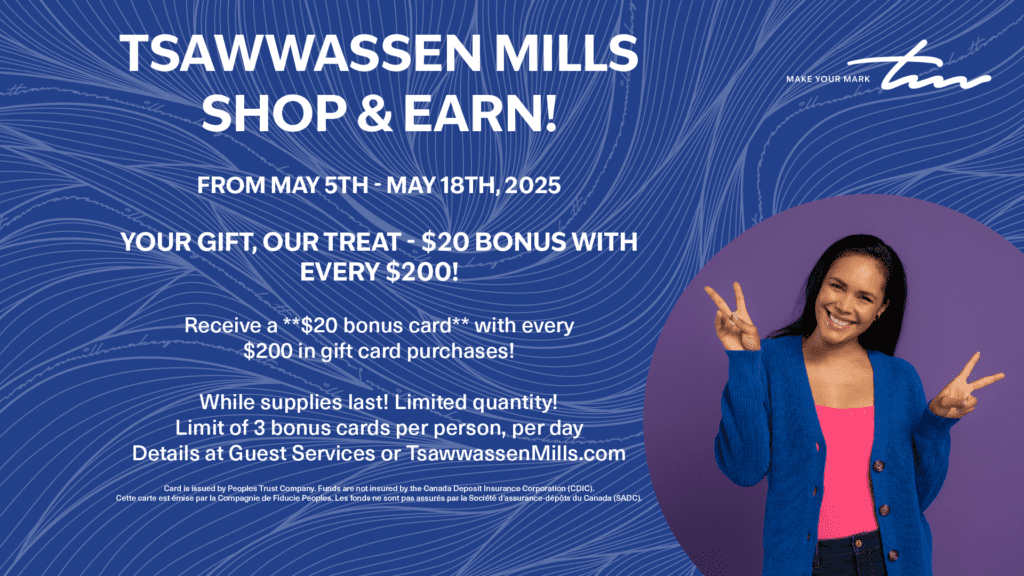 From May 5 to May 18, score a **$20 bonus card** for every $200 in gift card purchases at Tsawwassen Mills!